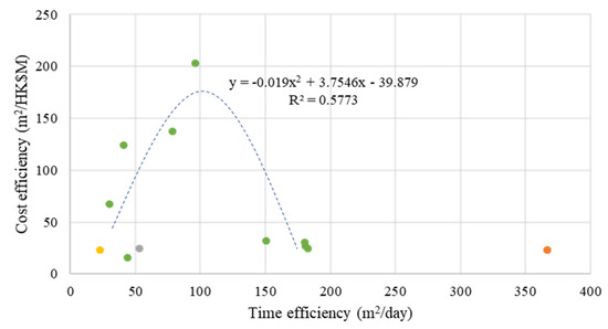 In addition, the mathematical expression generated from the statistical analysis is a quadratic function, where there is an optimal point (i.e., optimized time and cost efficiency for modular quarantine camps). From Project A to E (CFA: 2000 m2–6000 m2), cost efficiency increased with the increase of time efficiency; while from Project F to I (CFA: 13,000 m2–16,000 m2), cost efficiency decreased with the increase of time efficiency. It was mainly due to that the complexity of the project (e.g., CFA to be built) affects the efficiency of project delivery. Therefore, each project should be designed with an appropriate scale (e.g., moderate CFA) to best mobilize the resources for achieving maximized efficiency. Nevertheless, the results were derived assuming that all projects were delivered in the same level of urgency.