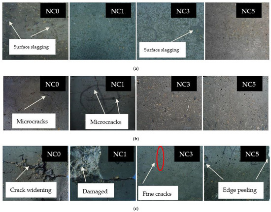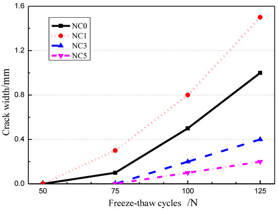 The change of concrete surface crack width under different freeze-thaw processes is shown in Figure 6, it shows the NC0, and NC1 specimens showed obvious surface cracks after 75 freeze-thaw cycles. The NC3 and NC5 samples showed obvious cracks after 100 freeze-thaw cycles. After 75 freeze-thaw cycles, several obvious penetrating cracks appeared at the end of NC0 and NC1 specimens, and the average widths of cracks were about 0.1 mm and 0.3 mm, respectively. After 100 freeze-thaw cycles, the surface of ordinary concrete and NC1 specimens had an obvious cracking failure, and the center of the crack extended to both sides. There were only slight cracks on the surface of NC3 and NC5 specimens, and the average crack widths were 0.2 mm and 0.1 mm, respectively. However, the surface erosion of the NC5 specimen was more serious than that of the NC3 specimen, with a small amount of aggregate spalling and large surface holes.