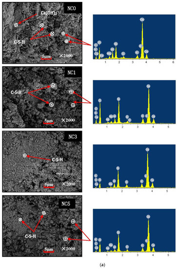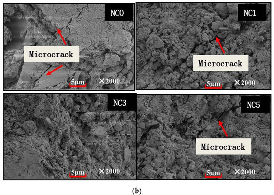 The microstructure of NMK concrete before and after freeze-thaw is shown in Figure 7. It can be seen from the diagram that before freeze-thaw cycles, the microstructure of the NMK concrete matrix is dense, the hydration products are filled between the matrix voids, and there are few cracks. After 30 freeze-thaw cycles, the internal components of concrete have different degrees of microcrack growth and expansion until the concrete cement slurry peeled off and the structure is crisp and loose. After 30 freeze-thaw cycles, apparent crack propagation occurred in NC0, and both CH crystal and C-S-H gel cracked. There were also apparent microcracks in NC1, and the inter-gel arrangement was loose. The microstructure of NC3 is still dense, and the number of pores is small; the microstructure of NC5 was more flexible than that of NC3, and the hydration products showed fine dispersion. From the above analysis, it can be concluded that an appropriate amount of NMK can effectively hinder the damage to concrete microstructure during freezing and thawing and slow down the initiation and propagation of microcracks.