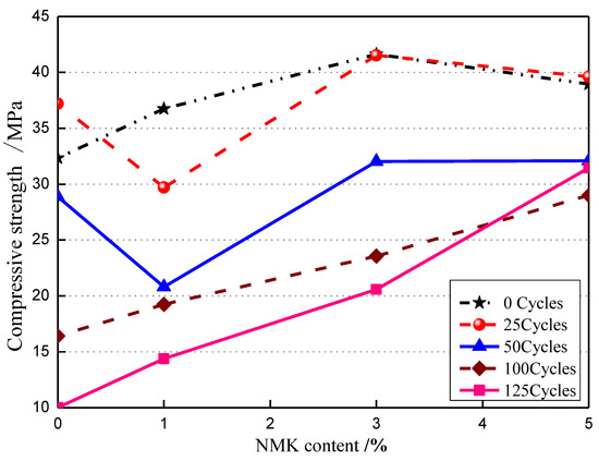 Relationship between compressive strength and NMK additions for concrete under freeze–thaw cycles.