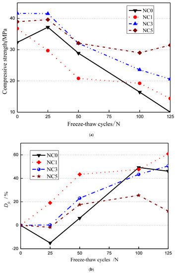 Relationship between compressive strength of NMK added concrete and the number of freeze–thaw cycles. (a) Relationship between compressive strength and freeze–thaw cycles; (b) Relationship between loss rate of compressive strength and freeze–thaw cycles.