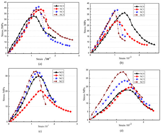 The relationship between the relative peak stress of concrete and the number of freeze-thaw cycles under different freeze-thaw cycles is shown in Figure 11. It can be seen from the figure that with the increase in the number of freeze-thaw cycles, the relative peak stress of concrete gradually decreases, indicating that the internal damage of concrete gradually increases and the pressure that can be progressively borne decreases. The peak stresses of NC0 and NC1 reduce considerably, indicating that the internal damage of concrete is extensive and cannot withstand enormous pressure. The decreasing trend of NC5 peak stress is slower than other concretes, meaning that the internal damage is light and the concrete matrix can withstand significant pressure.