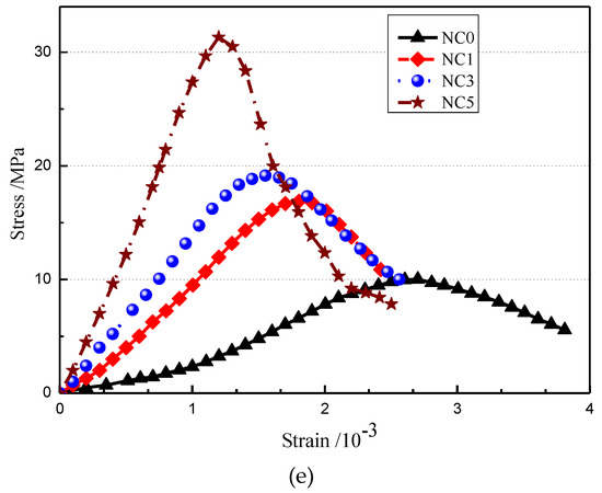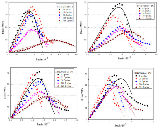 Stress-strain relationship of the concrete with various additions of NMK. (a) Freeze–thaw cycles: 0; (b) Freeze–thaw cycles: 25; (c) Freeze–thaw cycles: 50; (d) Freeze–thaw cycles: 100; (e) Freeze–thaw cycles: 125.