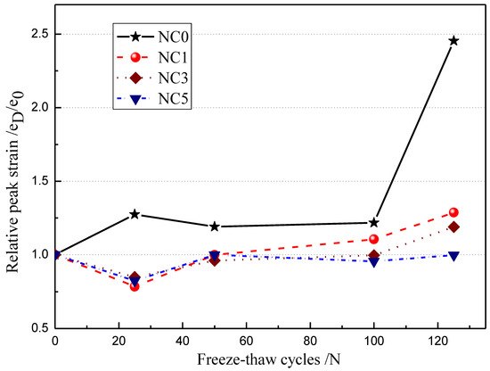 The relationship between the relative peak strain of NMK concrete and the number of freeze-thaw cycles is shown in Figure 12. It can be seen from the diagram that the relative peak strain of concrete increases with the increase of freeze-thaw cycles, indicating that the ability of concrete to resist deformation under axial pressure gradually decreases with the increase to internal damage of concrete.