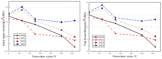 The relationship between the initial elastic modulus, peak secant modulus, and freeze-thaw cycles of concrete under freeze-thaw action is shown in Figure 13. It can be seen from the figure that with the increase in freeze-thaw cycles, the initial elastic modulus and peak secant modulus of concrete show a decreasing trend. The initial elastic modulus and peak secant modulus of NC5 decrease slightly. NC0 and NC1 change significantly.