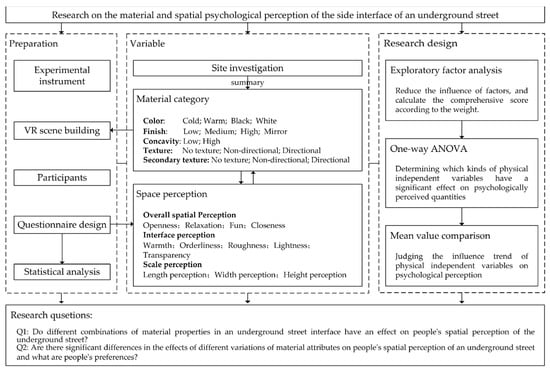 This study aimed to investigate the influence mechanism of the spatial psychological perception of the interface material design of underground streets. We first conducted field research and online research on underground streets in Xuzhou, China; Shanghai, China; Hohhot, China; and Fukuoka, Japan to summarize the interface materials commonly used in underground streets, and then deconstructed them into physical independent variables to construct experimental scenarios according to the material characteristics. We found that the characteristics of underground streets in Xuzhou were similar to those in Shanghai and other cities; furthermore, the underground streets in Xuzhou were convenient for research. Therefore, Xuzhou underground street was used as the prototype of the experimental scene, which kept its physical size and store layout while switching the interface material. Then, VR was used to simulate the scene and a questionnaire was used to obtain people’s evaluation of their spatial perception. Finally, the data obtained from the questionnaire were processed. Exploratory factor, one-way analysis of variance and mean comparison analysis were used to explore the effect of side interface material on spatial perception (Figure 1).