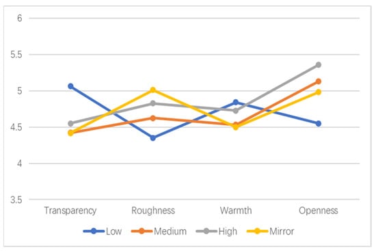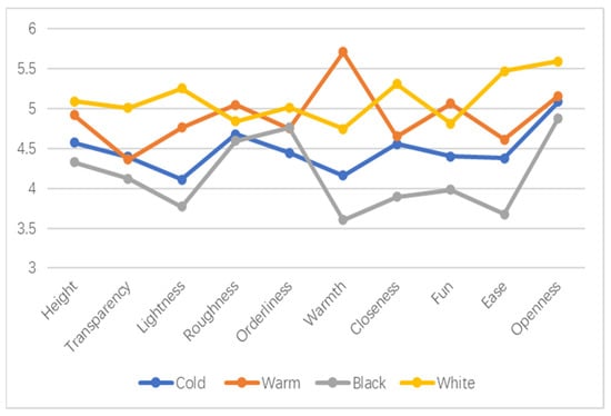 The mean value of the original scale data was obtained for the psychological perception data that had a significant effect on the classification of each physical independent variable, and a line graph was drawn. The closer the mean value was to 5, the higher the psychological satisfaction level, and the further the mean value deviated from 5, the lower the psychological satisfaction level.