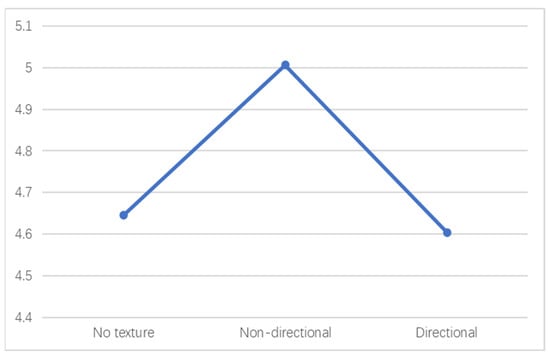 The analysis of the mean value of satisfaction with the warmth and coldness of the color of the side interface material and texture classification (Figure 6) showed that the satisfaction with the color warmth and coldness of the side interface composed of materials with no directional texture > materials without texture = materials with directional texture. Underground street scenes with no texture or directional texture to the side interface material tended to make the participants feel uncomfortable with the colors being too cold. The mean value of non-directional texture was closer to 5, indicating people preferred non-directional texture to satisfy their needs for color warmth.