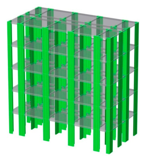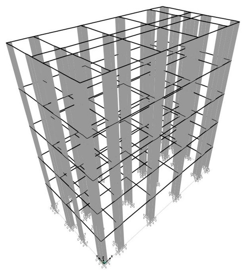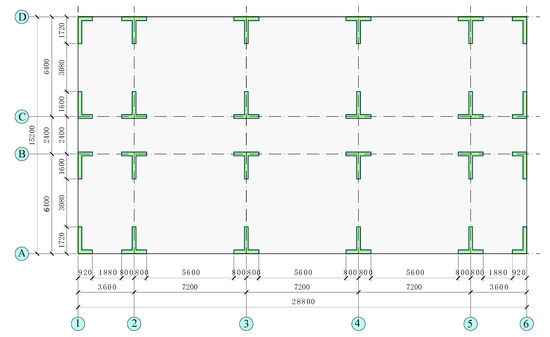 To accommodate architectural requirements, the prototype structure presented a ‘fish-bone’ floor configuration consisting of four rows of wall piers, with a longitudinal corridor running through the middle of each floor, as is the practice in many countries [10,11]. Figure 1 shows the plan layout of a typical floor of the prototype structure. Each wall pier possessed the same cross-sectional size throughout the building height. The wall-to-floor-area ratio was 3.75%. A 3D view of this structure is displayed in Figure 2.