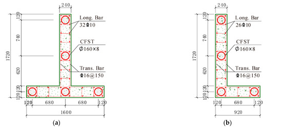 Each wall pier was characterized by a T or L-sectional shape. For the prototype structure, the wall thickness was uniformly 240 mm, irrespective of the wall shape. Two curtains of steel bars were used to reinforce these walls, while CFSTs were arranged in them to serve as strengthening elements. Grade C30 concrete was used to cast both the slabs and walls, while C40 concrete was applied to fill the CFSTs.