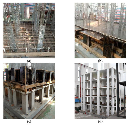 Micro-aggregate concrete (i.e., cement mortar) and fine meshes were used to construct the RC elements. The round tube of the CFSTs was simulated by a #304 stainless steel pipe due to the latter’s similar yielding properties to Q235 steel. Table 1 reports the measured mechanical properties of the construction materials used for the test structure. Figure 4 shows some construction scenarios and the appearance of the specimen before testing.