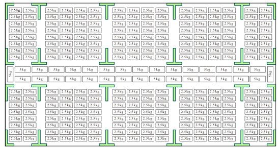 To mimic the gravity load applied to the prototype structure, a number of lead weights were attached to each floor such that the weight of the test structure plus the subsidiary lead produced nominal axial stresses approximately equivalent to those produced by gravity loads (dead load plus half of live load) in the prototype building. The resulting axial load ratio was approximately 0.5 in the first-story walls. Figure 5 shows the distribution of the lead blocks on a typical floor. Table 3 gives the mass of the prototype and the test structures.