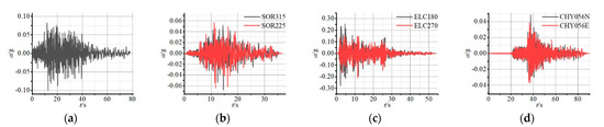 In compliance with these codified requirements, one artificial ground motion wave and three natural seismic records were used as the input excitations for the test structure, as shown in Table 4. The RGW wave, dominated by low-frequency long-period components, was generated by fitting the design response spectrum specified in [29]. The acceleration-time history curves of these selected ground motions are plotted in Figure 6.