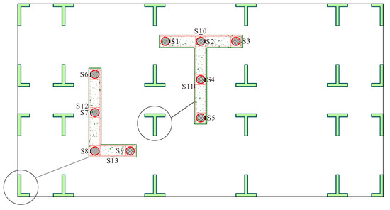 In order to monitor the dynamic strain response of the walls and embedded CFSTs near the ground level, strain gauges were attached to each steel tube of the interior T-shaped wall, and of the L-shaped wall in the southwest corner, as marked in Figure 7. In addition, strain gauges were mounted on the concrete surface of the aforementioned walls. Therefore, a total of 13 strain monitoring points were established.