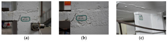 - To look at how the structure would fare under extremely strong earthquakes, excitations equivalent to the rare level of intensity 8 were exerted on the test structure (Phase IV, PGA ≤ 1.0 g). At the end of this final phase, the first three natural frequencies were decreased by 10.14%, 10.81%, and 17.36% in turn, in comparison with the previous measurements (W4). This suggested a further reduction in the structural stiffness. As shown in Figure 10, previous damages developed more severely. At the proximity of some slab-wall connections, spalling of concrete was obvious (Figure 10a,b). Several cracks even spread from one wall pier to another along the slab (Figure 10c). However, the structure and the walls still remained stable. Neither obvious tilt nor distortion of the specimen was noticed. It can therefore be concluded that the tested FSFW structure was able to resist the rare earthquakes far stronger than the design intensity.