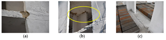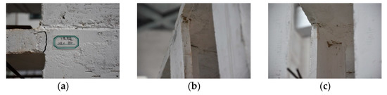 Figure 8. Damages after excitations of the moderate level of intensity 7 (Phase II): (a) a crack at a slab-wall connection; (b) another similar crack; (c) a crack on an L-shaped wall. - (3)