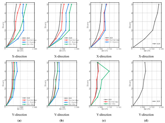 Comparison of inter-story drift ratio envelopes in different loading cases: (a) F7CXY-X; (b) B7EXY-X; (c) R7NXY-X; (d) R8RXY-X.
