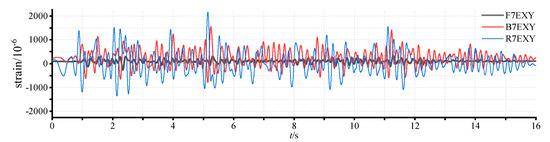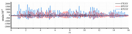 The yield strain of the steel tubes used in the CFSTs was roughly 1500 × 10−6. Clearly, in the case of the frequent level of intensity 7 (F7EXY in the figures), the strains at S8 and S9 were well within the elastic range. With the increase in excitation intensity, the strains increased markedly. Under the excitation equivalent to the moderate level of intensity 7 (B7EXY), the steel at S8 attained the yield strain, but that at S9 did not. This highlighted the larger strain demand at the web–flange intersection of the corner of the L-shaped wall. For the loading case of R7EXY (the rare level of intensity 7), both strains at S8 and S9 exceeded the yield strain, indicating the full mobilization of the CFSTs to resist lateral loads.