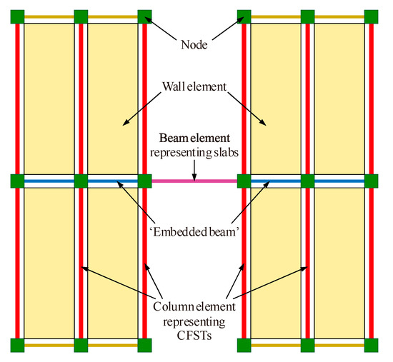 No element is provided in PERFORM-3D for modeling the composite walls with embedded CFSTs. Thus an ad hoc treatment was adopted in this study. The two-noded fiber-based column (line) elements available in PERFORM-3D were used to model the individual CFSTs in a wall pier, which were connected by the ‘embedded beam’ model [39] to ensure the deformation compatibility of the CFSTs in the same wall pier.