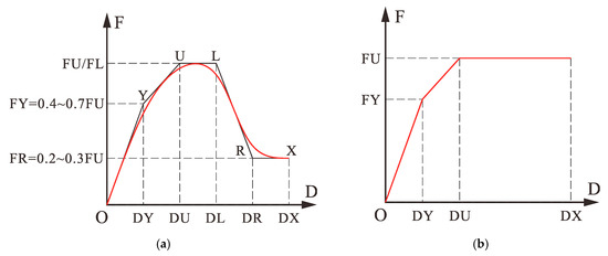Figure 17 illustrates the material constitutive models used for concrete and steel. Note that in PERFORM-3D, all generalized force–displacement (F–D) curves can only be composed of a specific number of line segments. In this study, the principle of equal area criterion (that is, the area under the line segments and the area covered by the constitutive curve are the same) was followed to determine the F–D curves for PERFORM-3D. The fitting diagram of the concrete’s constitutive relationship is shown in Figure 17a, and the tri-linear model for steel is shown in Figure 17b.