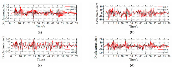 Figure 18 compares the experimental and numerical time-history displacements at the roof along the X or Y directions under different loading conditions. It is clear that, in general, the calculated results agreed well with the experimental records. However, in the later testing phase (i.e., R7EXY in the figure), the numerical model overestimated the actual roof displacements. This may be due to the limitations of using PERFORM-3D to simulate shear walls, as discussed in depth in [43], or it might likely be ascribed to the excessive reduction in the effective width of the slabs adopted in the modeling. It is noteworthy that although simulations of shear wall buildings have been extensively investigated (e.g., [44,45,46,47]), there are still challenges to accurately reproduce their non-linear behavior, especially when the walls are severely damaged.