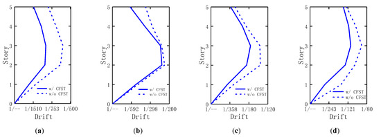 Figure 19 shows the comparison results for two scenarios (namely, two FSFW systems with and without CFSTs embedment) in terms of their inter-story drift ratio envelope in different loading cases. Obviously, the presence of CFSTs significantly reduced the lateral deformation of the test structure. In the case of small earthquakes (F7CXY-X), the inter-story drift ratio of the system without CFSTs exceeded the limit value of 1/800. Further, in the case R7NXY-X, the inter-story drift ratio of that system exceeded the limit value of 1/100. By comparison, the FSFW system incorporating CFSTs did meet all those lateral drift requirements.