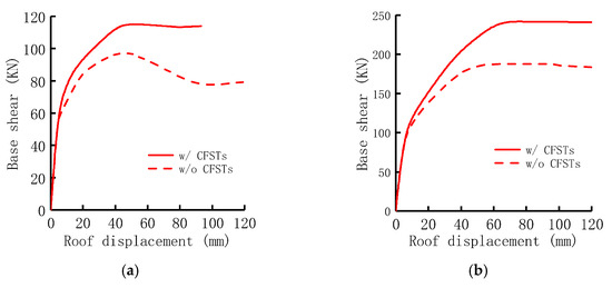 A push-over analysis was further conducted to see how the two systems could behave differently. A monotonically increasing horizontal force with an inverted triangular distribution was applied to the systems [48]. Figure 20 gives the push-over results along the X and Y directions. Despite their similar initial overall stiffness, the CFST-equipped system had considerably higher lateral load-carrying capacity than the system without CFSTs. This significant discrepancy clearly shows the utility of applying CFSTs in wall piers to resist seismic lateral loads.