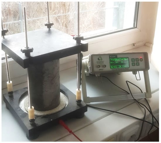 Three small cylinders with a diameter of 100 mm and a length of 200 mm were prepared for the bulk electrical resistance method. An rCON meter [] was used for the measurements. This test was also carried out according to ASTM C1876 []. The samples were stored in water and, after removal, lightly dried and immediately inserted between the measuring probes (see Figure 1).