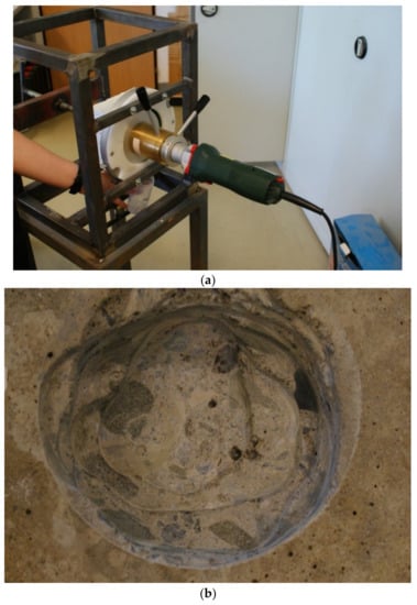 (a) Sampling of the exposed sample using a Profile Grinder; (b) the resulting layered drill in the concrete sample.