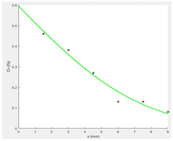 - The least-squares approximation procedure is described in detail in []. An example of the chloride profile and the interleaved curve is shown in Figure 3. The approximation is performed using an atomized algorithm searching for the nearest adjacent values for the chosen curve from Equation (1). This then makes it possible to determine the intersection with the y-axis, where the chloride ion value at the surface is, and also allows the diffusion coefficient to be determined from the analyzed profile.