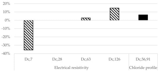 Figure 4 shows the percentage differences when the coefficient of the 28-day resistivity is chosen as the reference parameter. As can be seen in our case, the difference against the diffusion coefficient of the chloride profile is only 8%. However, it should be noted here that the diffusion coefficient from the chloride profile is introduced into the numerical calculation with a reference time of 56 days, which is the subject of further research below. Looking at the other values obtained from the electrical resistivity measurements, we see a high difference, which is a clear indication of the ageing of the concrete, but it remains to be seen for further results whether this difference is really significant.