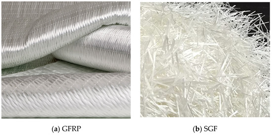 Composite materials produce a combination property of two or more materials that neither fiber nor matrix can achieve when acting alone [44]. Short-fiber-reinforced polymer (SFRP) composites are particularly attractive due to their simplicity in manufacture, low cost, and outstanding mechanical properties [45]. High fiber content is generally required to achieve a high-performance SFRP composite. As a result, the effect of fiber content on the mechanical properties of SFRP composites is of particular interest and significance [46]. Glass-fiber-reinforced polymeric composites were the most used materials in the production of composite materials [47]. Finally, adequate bonding between the FRP laminates and the RC concrete surfaces is critical for successful strengthening; failure to do so would result in undesirable premature failure before the ultimate load.