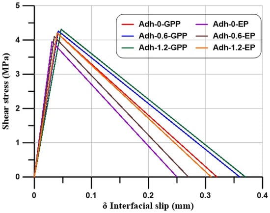 where ti and tc represent the thickness of adhesive and the concrete thickness, respectively. Gi and Gc are the shear modulus of the adhesive and concrete, respectively. The values of shear stress of each resin τmax according to the experimental results used for B1-0-GPP, B2-0.6-GPP, B3-1.2-GPP, B4-0-EP, B5-0.6-EP, and B6-1.2-EP are 4.2 MPa, 4.26 MPa, 4.31 MPa, 3.95 MPa, 4.1 MPa, and 4.2 MPa, respectively (See Figure 3). The damage initiation criterion was described by using the quadratic nominal stress function: