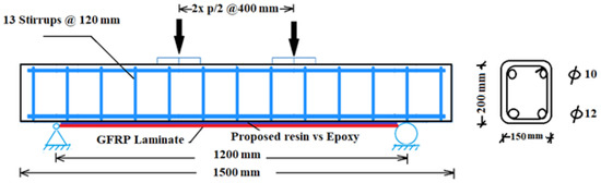 The experimental program included seven simply supported RC beams. All the beams had an equal section of 200 mm depth, 150 mm width, and 1500 mm length. The reinforcement bars, dimensions, and geometry information of the tested beams are illustrated in Figure 4. The main bottom reinforcement was two bars of 12 mm diameter with a design yield stress of 410 MPa, and the top reinforcement bars were two bars of 10 mm diameter with the same yield strength. Vertical stirrups were constructed using 125 mm-spaced, 8 mm-diameter bars with a yield strength of 240 Mpa to ensure that all tested beams failed in the flexural mode according to ACI-19 [52].