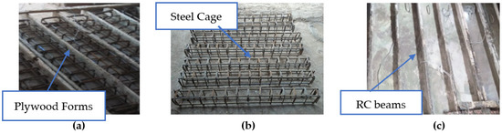 (a) plywood forms; (b) steel cages; and (c) casting of RC beams.