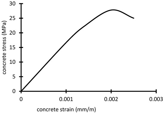 The experimental compressive stress–strain curve for concrete as illustrated in Figure 4 was used in the FE program. The concrete tensile strength was equal to 2.1 MPa. The modulus of elasticity of concrete (Ec) was 26,985 MPa according to the compressive stress–strain curve (See Figure 4, Section 2.3.1). Two primary failure modes are considered for concrete according to (CDP): compressive crushing and tensile cracking. The stress–strain response under uniaxial tension followed a linear elastic relationship up until a value of the failure stress was attained.