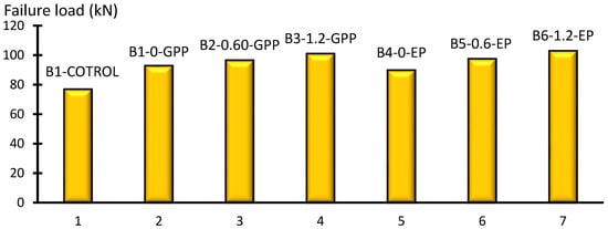 - The failure loads of beams B1-0-GPP, B2-0.60-GPP, and B3-1.2-GPP were greater than control beam B0-Control by approximately 20.80%, 25.60%, and 31.40%, respectively, whereas the failure loads of beams B4-0-EP, B5-0.6-EP, and B6-1.2-EP were greater than the control beam B0-Control by approximately 16.90%, 26.90%, and 26.10%, respectively. The results showed that increasing the SGF ratio in the GPP had a clear effect on raising the capacity of the beam due to the enhanced interfacial bond shear strength. In addition, the GPP had a great effect on increasing the failure load capacity of the tested beams.