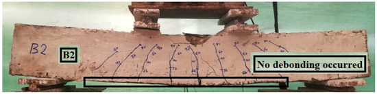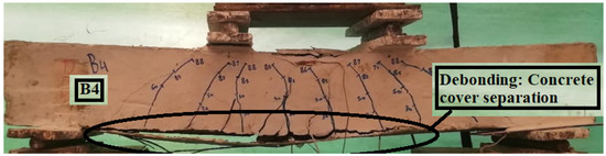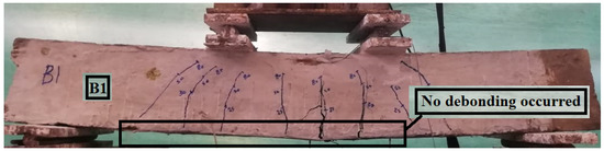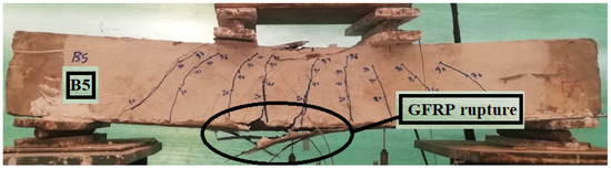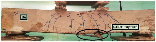 Figure 10, Figure 11, Figure 12, Figure 13, Figure 14, Figure 15 and Figure 16 depict the crack patterns of the tested beams that were tested until they failed. For beam B0-Control, the first crack was noticed at a load of approximately 31.20% of the ultimate load. The first crack appeared at a load of approximately 26.90%, 26.90%, 25.70%, 28.90%, 27.70%, and 25.30% of the ultimate load for beams B1-0-GPP, B2-0.60-GPP, B3-1.20-GPP, B4-0-EP, B5-0.6-EP, and B6-1.20-EP, respectively. Most cracks appeared initially under the loads on the bottom surface of all tested beams. Based on the outcomes of the experiment, no debonding occurred for laminates when using GPP with different SGF ratios. On the contrary, there was a debonding when using EP for beams B5-0.6-EP and B6-1.2-EP; however, for the beam B4-0-EP, the failure mode was laminate debonding and concrete cover separation. GFRP reduced the tensile damage that occurred in concrete due to the increase in energy absorption [54,55].