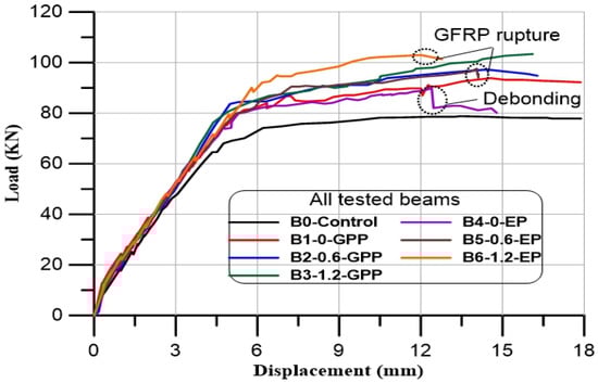 Figure 17 illustrates the load–deflection relationship for tested beams with GPP and EP as adhesive material. All beams displayed linear behavior up to the cracking load. The maximum deflection of tested beams B1-0-GPP, B2-0.6-GPP, B3-1.2-GPP, B4-0-EP, B5-0.6-EP, and B6-1.2-EP was less than the control beam by approximately 14.60%, 6.90%, 6.20%, 19.30%, 5.92%, and 17.10%, respectively. The results showed that GPP as adhesive material paste enhanced the maximum beam’s deflections better than EP. Also, it was found that using GFRP with EP reduced the mid-span displacement of the tested beams [56,57,58].