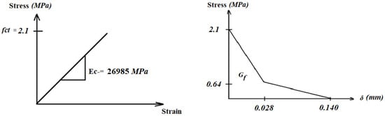 The initiation of microcracking in the concrete material is correlated with failure stress. A softening stress–strain response was used to illustrate the propagation of microcracks beyond the failure stress. Therefore, elastic modulus, Ec, and tensile strength, ft, are required to define the first part of the relationship. For descending branch, the fracture energy Gf approach was used to define the post-peak tension failure behavior of concrete, as shown in Figure 18. The area beneath the concrete’s tensile curve following the peak value was the fracture energy Gf.