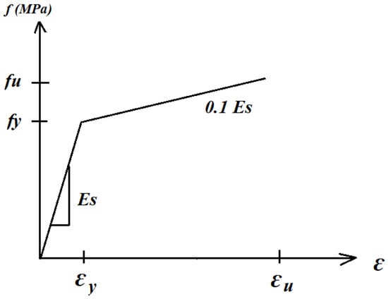 Figure 19 illustrates a bilinear elastic–plastic stress–strain curve for reinforcement bars. The embedded region was modeled for the reinforcement in this investigation. Table 6 illustrates the mechanical properties of reinforcement bars. The interaction surface between reinforcement bars and concrete was assumed to be a perfect bond. In the current study, the GFRP was assumed to be a linear elastic isotropic material. Table 7 illustrates the properties of CFRP laminates as specified by the manufacturer.