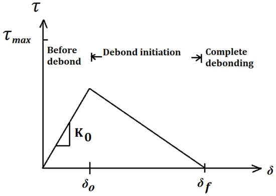 The GFRP laminate–concrete interface can be more effectively modeled using the cohesive model in ABAQUS. When dealing with debonding issues of strengthening materials, cohesive elements and surface-based cohesive behavior are preferable alternatives for this type of modeling. Surface-based cohesive behavior requires a linear elastic traction separation as well as damage initiation and evolution laws, and it has very comparable formulas and constitution laws to cohesive elements. A graphic representation of a standard bilinear traction–separation rule expressed in terms of effective traction τ and effective opening displacement (Interfacial slip) δ is shown in Figure 20. The initial stiffness K0 is specified as [56] and is modeled as a rich zone of small thickness at the interface. The initial stiffness can be expressed as follows: