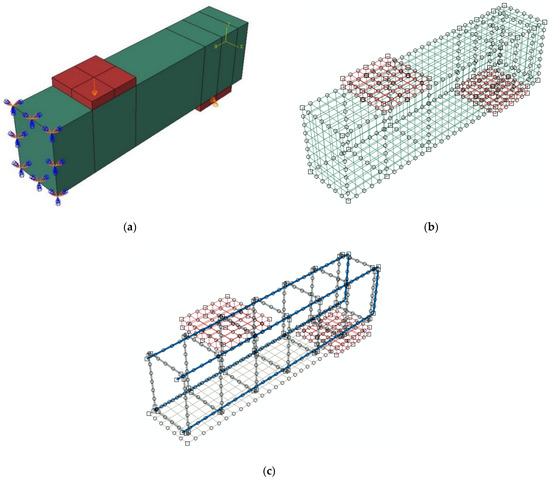 Geometry and element mesh. (a) Geometry of half of a typical beam; (b) Finite element mesh of half of a typical beam; and (c) Reinforcement bars, stirrups, and GFRP laminate.