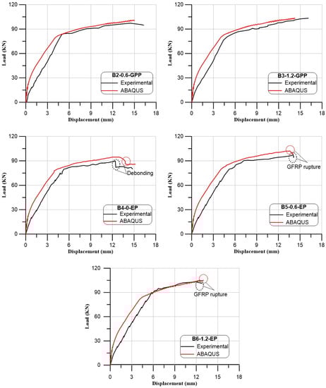 - The experimental findings and FE predictions are shown to be in good agreement. Due to the complexity of using the cohesive model in modeling the GFRP laminate–concrete interface, there was a slight variation in the results.
