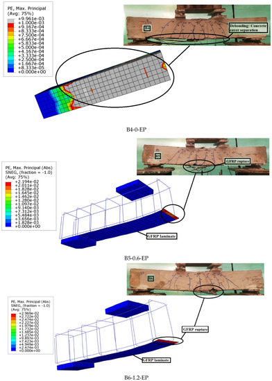 Figure 23 shows the final finite element cracks of the examined beams. All failure modes obtained numerically were tension failures at the flexural zone. All cracks formed in the middle third of the beams verified the experimental results. The experimental findings and FE predictions can be seen to be in good agreement. Due to the complexity of using the cohesive model in modeling the GFRP laminate–concrete interface, there was a slight variation in the results.