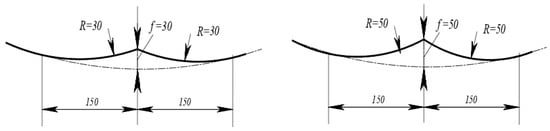 The overall model dimensions were 1200 × 850 × 550 mm. The field joint was formed from two 2 mm thick VSt3sp grade steel sheets, rolled along a radius of 1520 mm and welded at the joint. The joint imperfection in the form of depression was modeled by rolling the sheet edge along a radius of 30 mm and 50 mm and the angularity formation in the form of a “heart”. The geometric scheme of the wall imperfection in the field joint zone in the model is presented in accordance with Figure 1.