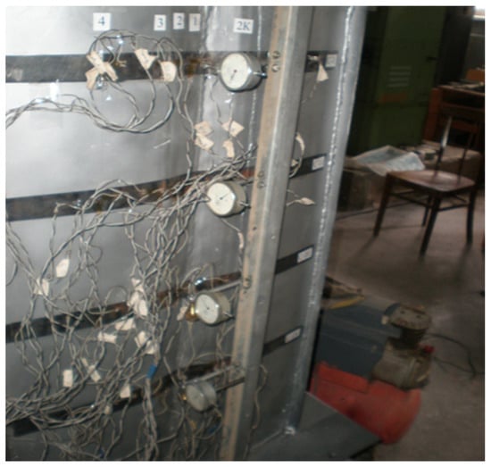 Relative strains of the model wall were measured by strain-measuring instruments [40,41,42,43,44,45,46,47,48,49]. As sensing devices for measuring relative strains, single-element, loop strain gauges with a 10 mm foil base were used. The strain gauges were mounted with Tsiacrin-30 glue, which is factory-made and does not require heat treatment.