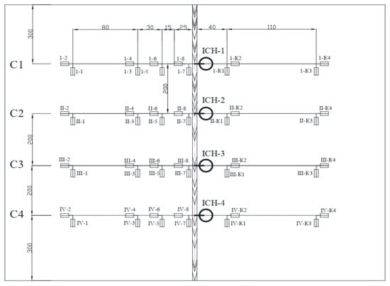 To register the vertical field joint axis movements in the characteristic four sections, ICH-04 dial indicators with a division value of 0.01 mm were installed, which were fixed on special brackets, in accordance with Figure 2. The strain gauges were glued along four characteristic sections (C-I, C-II, C-III, C-IV) along the model height, in accordance with Figure 3. For each section, 6 measurement points were considered. The strain gauges were glued in such a way that at one point, it was possible to measure the hoop and axial stresses in the model wall. In total, measurements were taken from 32 active and 16 control strain gauges in the experiments. In this case, the total test zone height was taken equal to 600 mm, and its width was 300 mm.