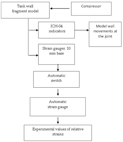 The pressure in the model was created by a compressor and controlled by a spring pressure gauge MVTP-160, with a division value of 0.02 MPa. The block diagram for testing the models, instrumentation and data determined in the experiment are presented in accordance with Figure 4. According to the relative strains measured during the experiment, the stresses were recalculated and the stress-strain state of the wall in the field joint zone was analyzed.