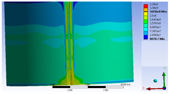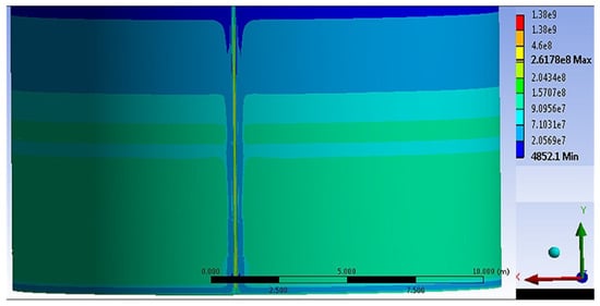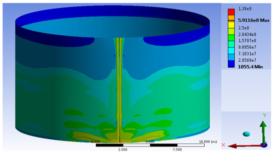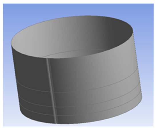 The design of a typical vertical cylindrical tank with a volume of 3000 m3 and the stress-strain state of the tank wall of variable thickness were considered in accordance with the paper [61]. The tank material elasticity modulus and Poisson’s ratio were taken as follows: E = 2.1 × 1011 Pa; v = 0.3. One must assume that the tank was completely filled (h = 11.92 m) with the density of the liquid γ = 1000 kg/m3. The adequacy of the results was assessed by comparing the stress concentration factor values obtained by calculations in the ANSYS and the values obtained from the polynomials, which take into account the cylindrical tank wall field joint imperfections.